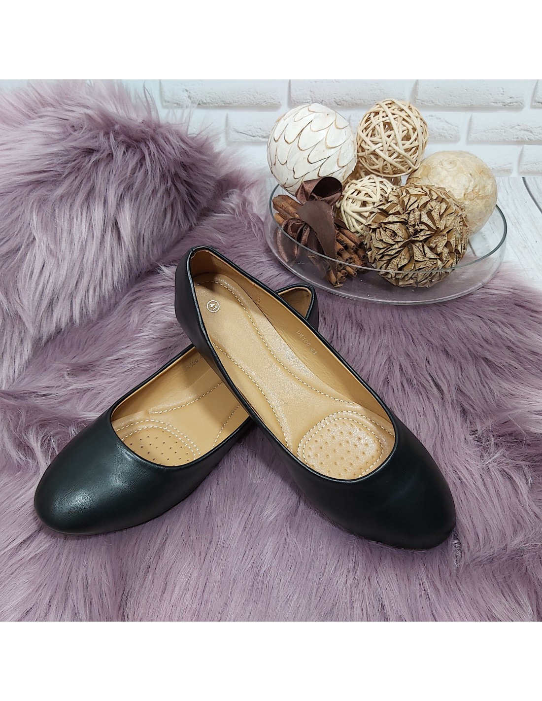 Baleriny z bardzo miękkiej ekologicznej skóry w głębokim czarnym kolorze. Płaski obcas i bardzo miękka wkładka zadbają o komfort twoich stóp.