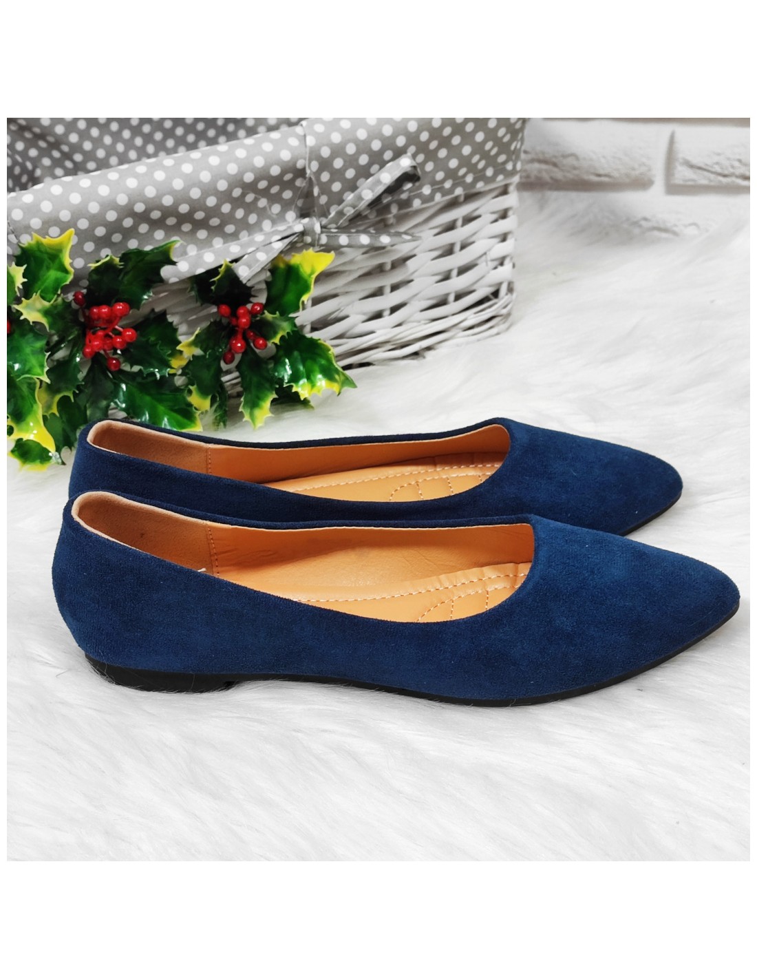 Wyjątkowo zgrabne balerinki damskie wykonane z wysokiej jakości zamszu ekologicznego w kolorze ciemnego granatu. Miękkie zamsz ładnie układa się do stopy, zgrabne noski dodają lekkości. Płaski obcas i komfortowa wkładka zapewnią wygodę w trakcie codziennej bieganiny. Dobrze sprawdzą się jako obuwie na zmianę. Ich uniwersalna stylistyka sprawia, że pasują do każdej stylizacji.