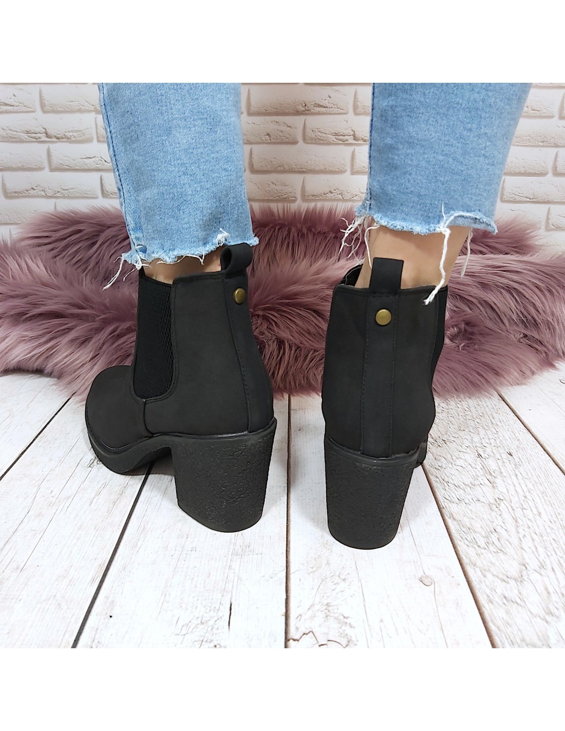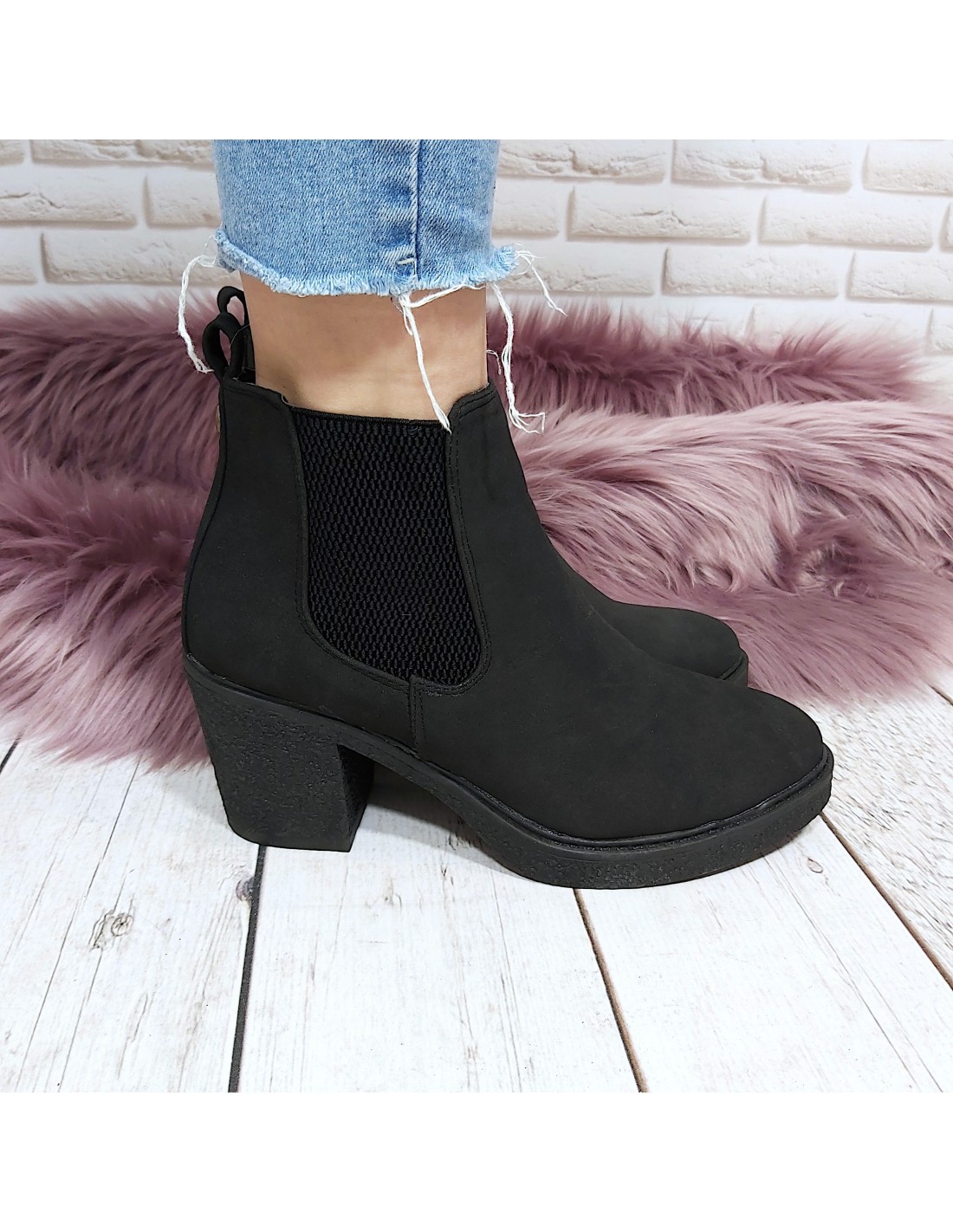 Proste, uniwersalne botki damskie sztyblety. Wykonane z miękkiego ekologicznego zamszu. Stabilny obcas o wysokości 7 cm. Po bokach gumy zapewniające komfort w trakcie chodzenia. Wygodny codzienny model bez ocieplenia.
