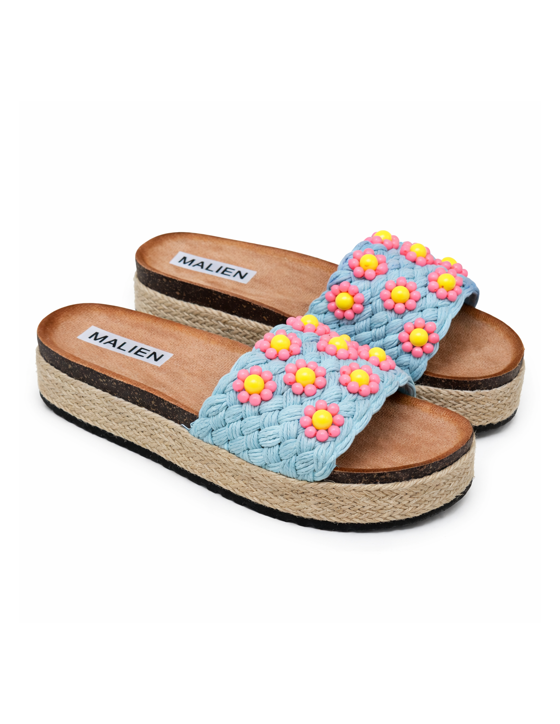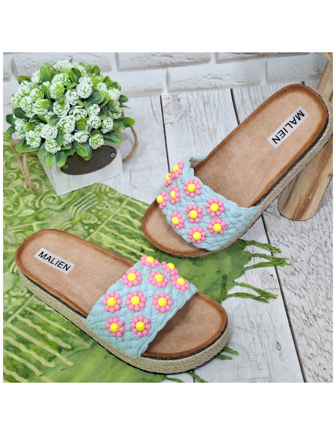 Te klapki damskie na platformie to idealne połączenie wygody i letniego stylu. Pleciony wierzch oraz ozdobne kwiatki z koralików tworzą wyjątkowy, kobiecy design inspirowany modą boho.