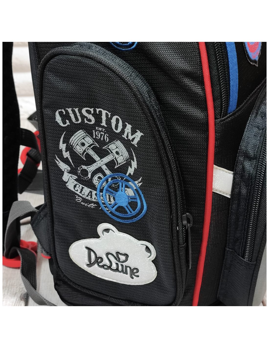 - jedna komora z organizerami (plan lekcji, kieszonki, siatki, gumka mocująca)