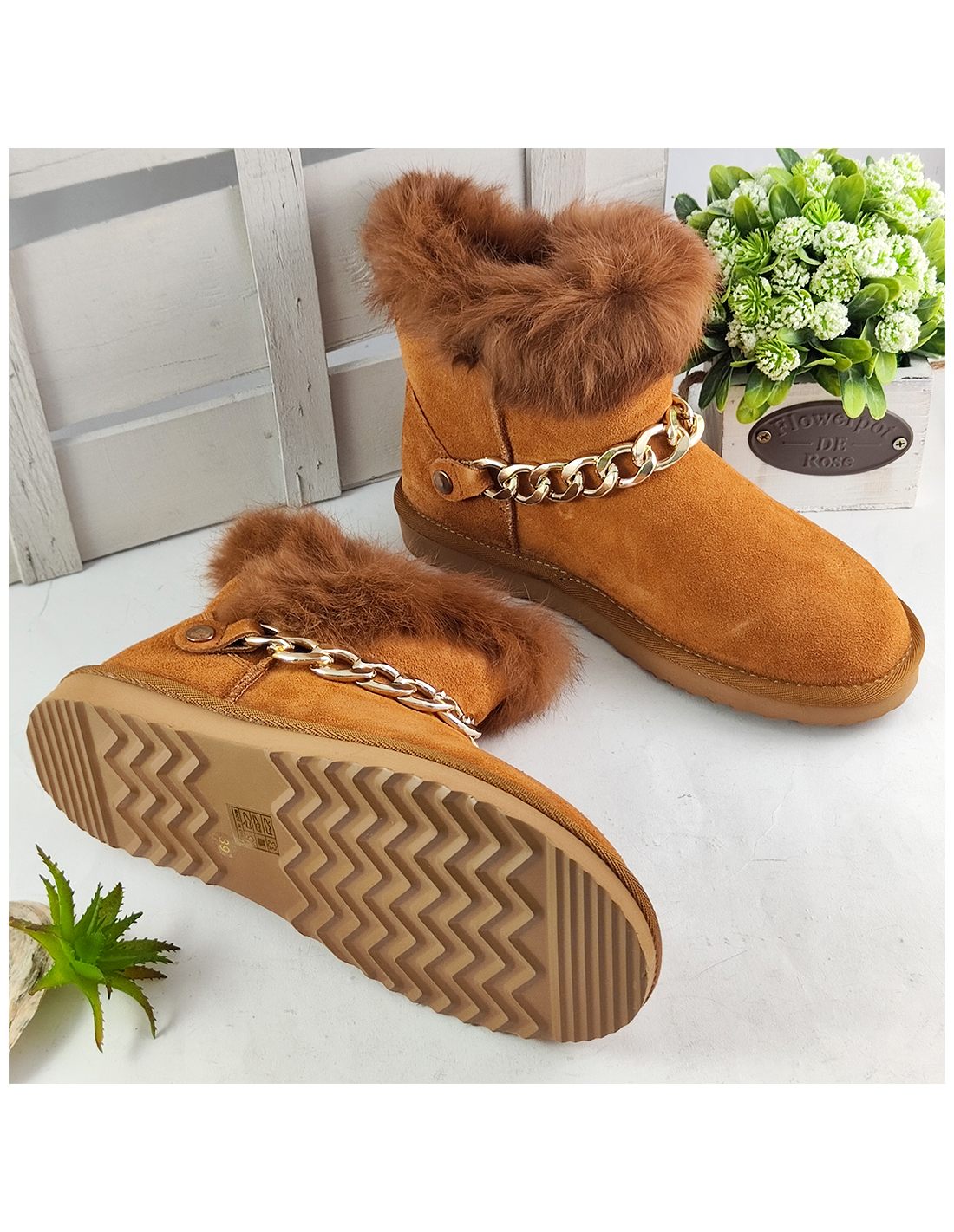 Mocno ocieplane śniegowce damskie z naturalnej skóry. Kultowy model w nowej odsłonie - góra cholewki wykończona futerkiem z królika, z przodu ozdobny złoty łańcuch. Wygodne w zakładaniu, wystarczy wsunąć stopę. Idealnie sprawdzą się przy mroźnej pogodzie.