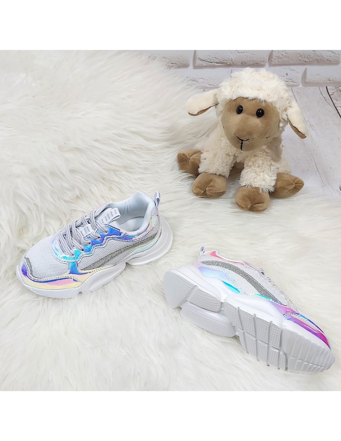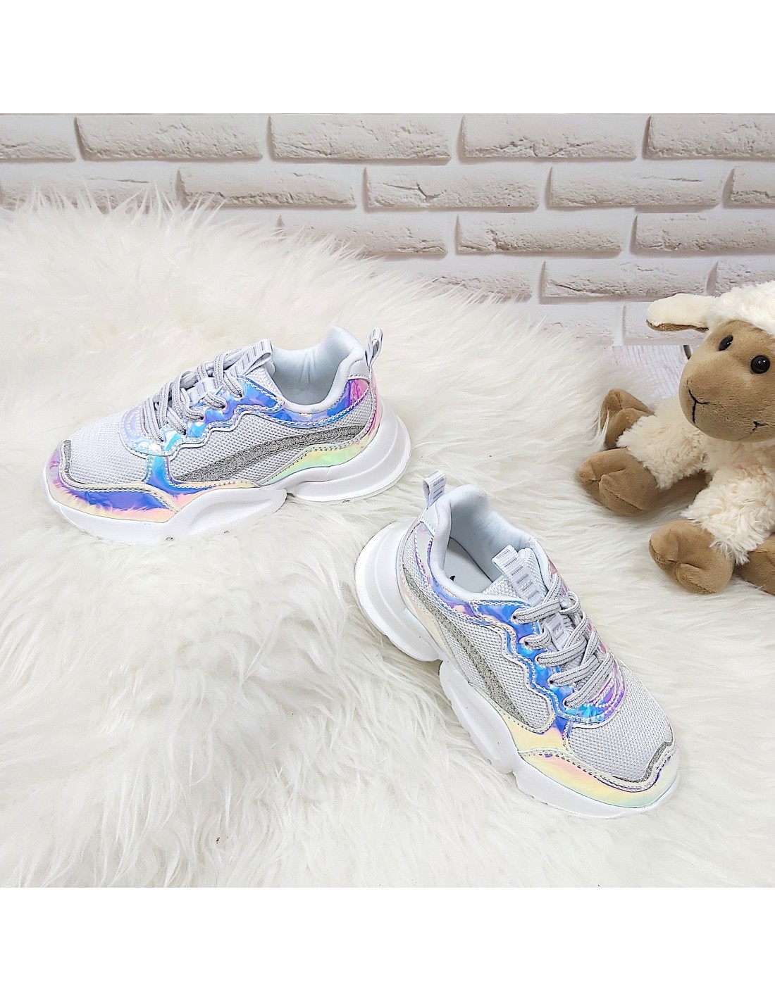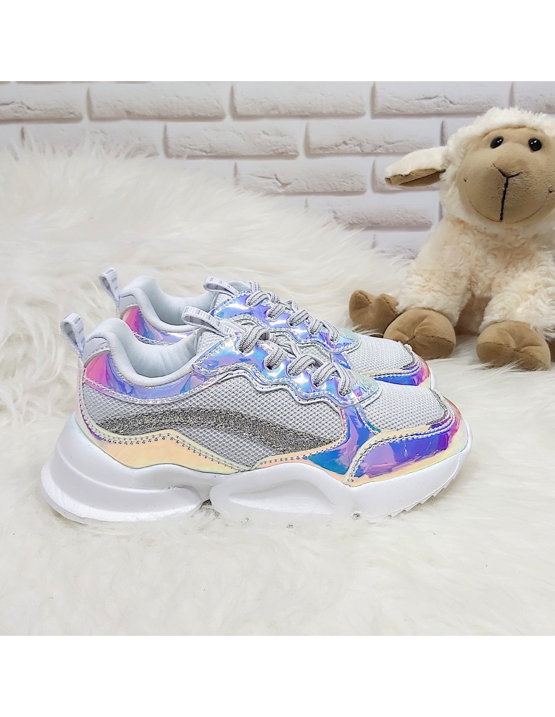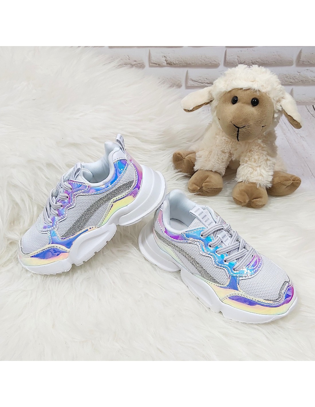 Wykonane z tkaniny, wzmocnione holograficznymi detalami i niezwykle lekkie. W środku miękka wyściółka. Modna w tym sezonie stylizowana podeszwa. Połyskujące kolorowo wstawki doskonale harmonizują ze śnieżnobiałą cholewką. Łatwe w zakładaniu - dzięki gumkom imitującym sznurowadła wystarczy wsunąć stopę. Mała modnisia nie będzie musiała tracić czasu na wiązanie! Język zabezpieczony przed przesuwaniem. W słońcu nie można od nich oderwać oczu. Stylistyka nawiązuje do najmodniejszych trendów tego sezonu.